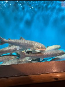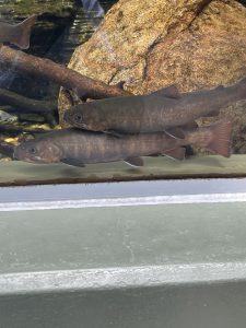 水槽の左側から右側にかけて水流が作られていて、イワナたちの多くは水流に逆らうようにスイスイと泳いでいますが、